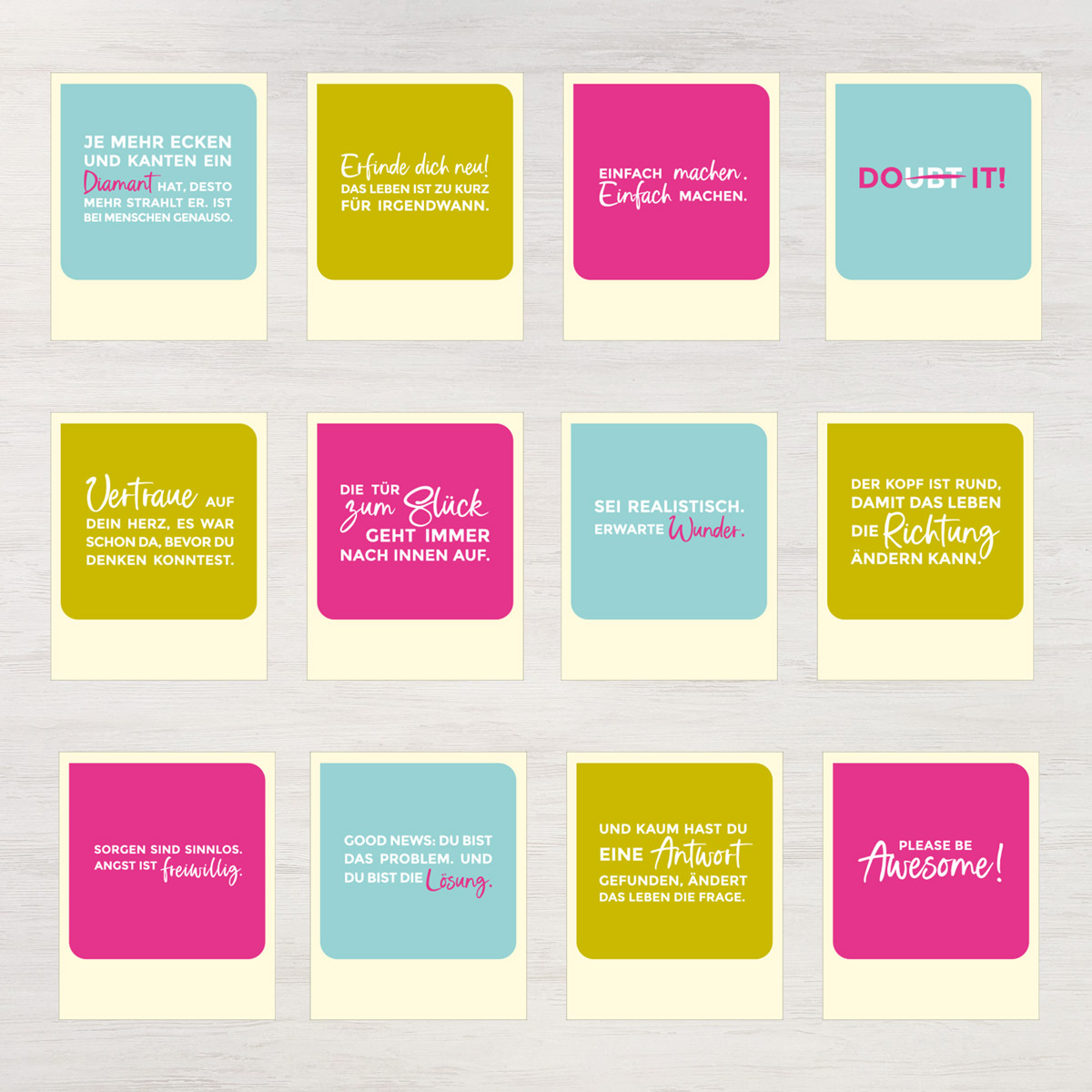 • BOLD BUNDLE: Zwölf hochwertige Postkarten mit Karins Lieblingssprüchen. Zum Geburtstag, in einem Blumenstrauß, an die Wand gepinnt … ach, und verschicken kannst du sie natürlich auch.